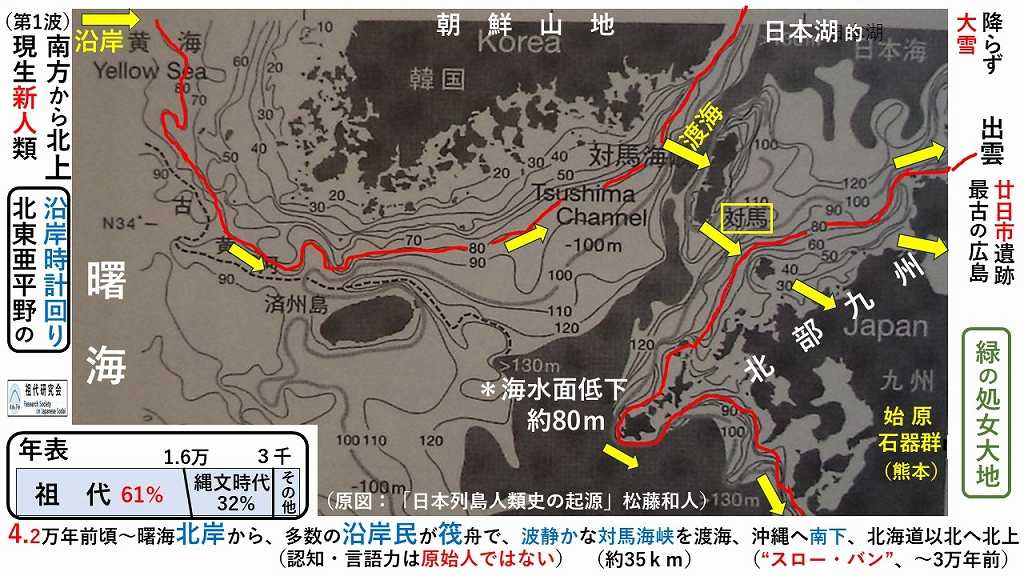 図左:海水面が低下し地形が違った曙海北岸を時計回りで、4.2万年前頃から多くの沿岸家族が北部九州に筏で約35kmの波静かな海峡を渡海しました。長い期間に続々と渡って来て拡がって行ったビッグ・バンならぬ“スロー・バン”で、その後、沖縄へトカラ越え南下、北海道以北へ北上と処女地の列島各地に拡がって行きました。