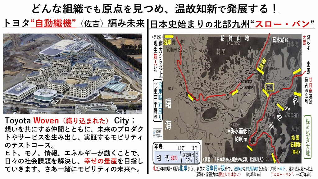 図右:日本史始まりの5W1Hの原点が推定できることは、世界の驚きです。現生新人類が4.2万年前頃に進出して来て、始まりは曙海北岸の沿岸民が筏舟で対馬海峡を越えて北部九州に渡海し、祖人Sojinはトカラ越えで沖縄へ南下、本州両側を北上し北海道以北へ拡がったビッグ・バンならぬ“スロー・バン”でした。言語を話し、伊豆の生業航海、陥し穴猟、環状キャンプ、磨製石器、釣り針の発明など、認知力・社会性が既に原始人ではなかった始まり祖代Sodaiの特色ある暮らしの数々が注目されています。