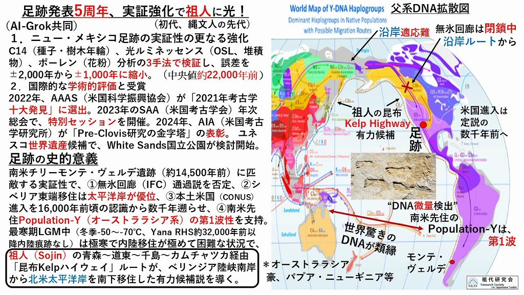 2021年9月発表後の遺跡年代の3分析手法による再検証(Pigati et al., Science 2023等)により、足跡(約23,000〜21,000年前)の実証性が大幅に強化し、国際的な学術評価を得ました。世界遺産登録も検討開始しています。また、近年の遺伝子研究の進展(Population-Y、Moreno-Mayar et al., 2014) による南米第1波の微量DNA共有検出のPopulation-Yの衝撃(豪等オーストロララシアとの先住民DNAの類縁)と併せれば、遺跡は定説を崩し意義深く氷河期極寒の時代の状況から「最初のアメリカ人」沿岸進入説を高め、祖人Sojin(初代日本人、縄文人の先代)の昆布Kelpハイウェイルートの渡米移住説に光を当てています。