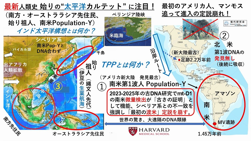 図右:「最初のアメリカ人」はマンモスを追って進入の説が崩れて近年の西沿岸ルート説の高まりから、北千島で縄文遺跡が発見されているコロボックル石器人・留頓(るとん)、沿岸移住の道東「発射台」(AI命名)、伊豆祖人Sojin(縄文前)の3.8万年前の神津島への生業航海などに光が当たっています。
