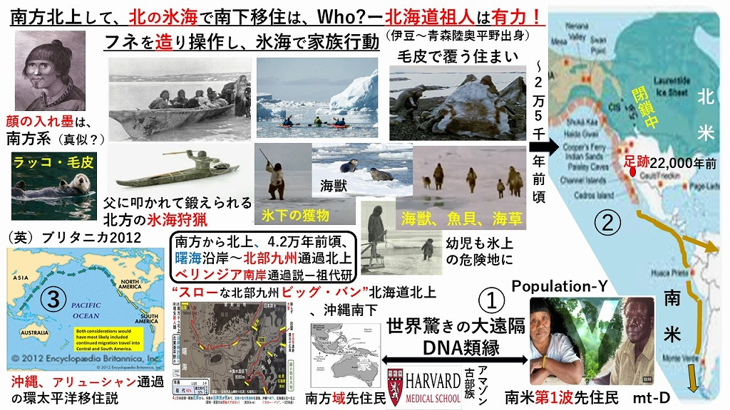 アメリカ新大陸に現生人類が到達し進入・南下した問題の実証の”足跡”は、約22,000年前に来た証拠です。氷河期極寒のシベリアで内陸狩猟族の移住とフネを持つ沿岸暮らしへの適応は厳しく、海洋性を有する日本の先住者・祖人(初代日本人、縄文人の先代)が太平洋岸Kelp (昆布)Highwayルート海沿いに移住した説に、光が当たっています!