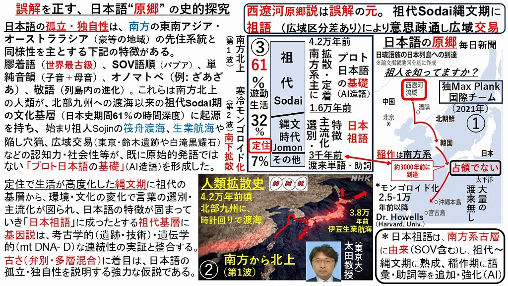 図③万件超えの祖代Sodai遺跡が示す祖人Sojinたちの言語を有する活動は、日本史の基層であり61%の時間深度なのです。定住で生活が高度化した縄文時代は、「日本祖語」が出来上がって行った時代であり、寒冷モンゴロイド(身体変化)の南下進入は、日本史の始まりからずっと遅れた第2波なのす。まして北の西遼河系の渡来難民の影響が及んだ3千年前は、南方系の稲作伝搬が言われる時期でしかも新しいことです。大量の渡来は無かったとみられている日本史の大陸から離れた島国における古さが言葉を選び抜き、渡来の多様さと島内の栄枯盛衰が長い時の中で多層に混合して熟成され、孤立・独自性をもたらした(仮説)ものでしょう。
