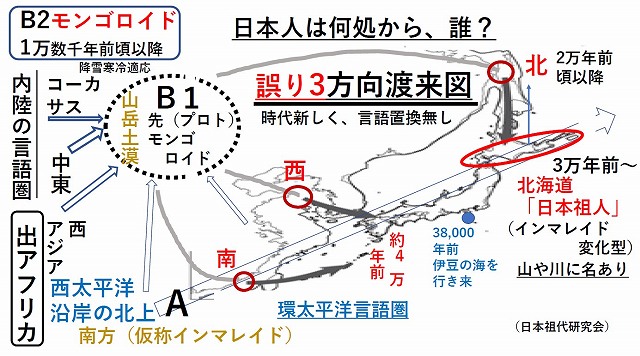 日本人は何処から?3方向渡来図の出発地(赤丸)がおかしく、B1地域とちゃんと描くべきです(Aからなら意味なし)。ところがここで、ジンギスカンにびっくりした欧米学者の誤りは、AとB1を同じ「古モンゴロイド」と呼んでいることです。