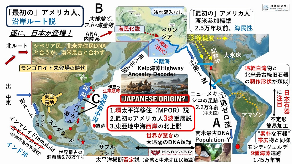 図左C:南方の「インマレイド」(古モンゴロイド用語は不適切)が、1.環太平洋移住、2. ➀➁③の 3波重層でアメリカ進入南下、3.東亜地中海東岸の遺跡(赤丸)充実から、連接した西岸北上説を祖代研は提唱しています。