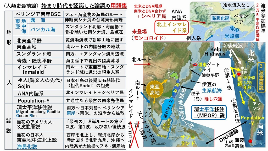 ―環太平洋移住(MPOR)説(スンダランド域~東亜地中海西沿岸~日本列島~千島~ベリンジア南岸~沿岸ルートで南米の拡散)は、「マンモス追い進入」定説の崩れた状況で、DNA(技有)/人骨の形質(有効)・考古学(技有)における近年の分析成果(一本)の総合的な考察により北海道、実は「青森・陸奥平野祖人の渡米」説を発表します。