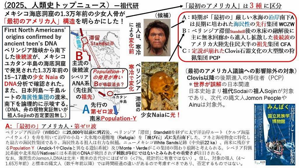 The traditional academic mainstream overly emphasized the later wave, focusing on the quantitative dominance of the inland hunter-gatherers (ANA-related B). As a result, the chronological precedence demonstrated by Population-Y in South America has been underestimated. The true understanding requires acknowledging the multi-wave arrival and dispersal via the coastal route. “Dual Definition of the First Americans.” 1. **Chronological Precursor: The Zero Wave (Ancestor-related A) **is a Circum-Pacific marine-adapted lineage linked to South American Population-Y. This Ancestor-related A is also suggested to have deep ties with the Aomori-Hokkaido Ancestor-related lineage (PAHK). 2. **Quantitative and Cultural Foundation: The Mainstream Wave (ANA-related B) **constitutes the widespread and major ancestry of Native Americans. They are a mixed group of North Eurasians who dispersed after a Standstill in Beringia. It is also pointed out that the dispersal timing of this Wave B is highly likely not to align with the 22,000 BP footprints found in New Mexico. -RSoJS #FirstAmericans#NewTheory