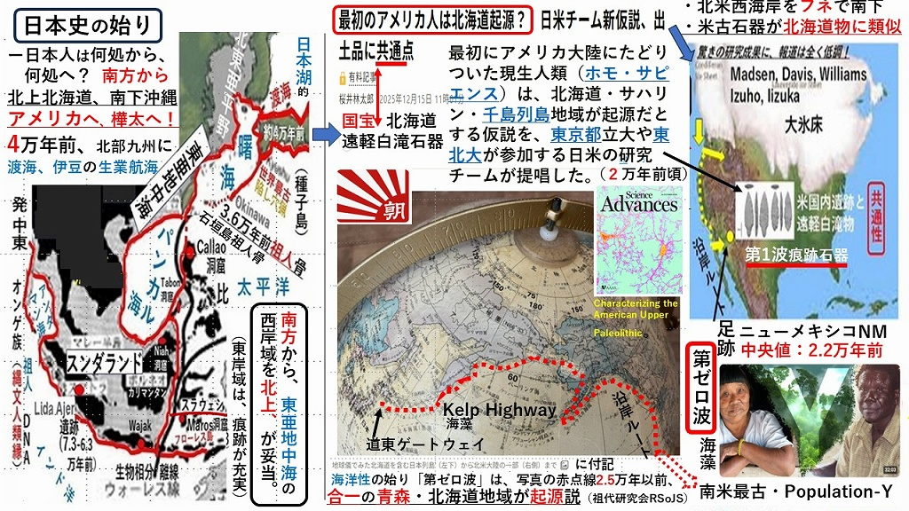 図中・右:「最初のアメリカ人」は北海道起源と初報道(第ゼロ波の起源地域は正しくは、青森・北海道-祖代研)があった2025です。北部九州から列島東西を青森・陸奥平野に北上した祖人(沖縄へ南下)はベリンジア南岸から、アメリカ新大陸が大氷床で閉鎖中の西沿岸ルートを南下・拡散したと考えられています。最初の第ゼロ波は米国ニューメキシコの「足跡」から、DNAがアンダマン・豪等の南方域先住民と類縁の南米最古のPopulation-Yシグナルへと繋がっているもの(写真赤点線)と考えられます。北海道祖人は基本的に青森祖人の子孫でしょう。樺太南下影響は、2.5万年前以降の細石刃文化とみられていますので、第ゼロ波には間に合いません。続く第1波は、米国各地の最古級遺跡の旧石器と北海道遠軽の国宝・白滝石器が類似を実証という今回の日米チームの発表をメディアが報じています。一応、樺太・サハリン影響も考えられます。