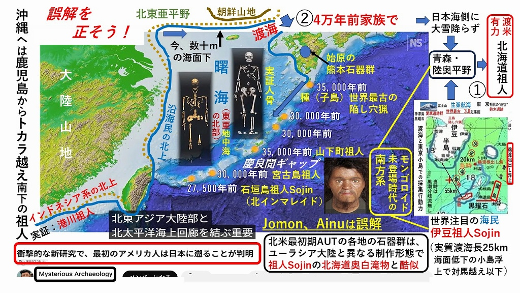 (Conclusion) With the discovery of Australasian DNA (Population-Y) in South America, it is now theorized that the First Americans migrated south along the western coast of the New World. Consequently, the seafaring Hokkaido Sojin have gained significant attention. Their DNA shows affinities with the southern Inmalaid people, leading to the “Pacific Rim Migration Theory.”