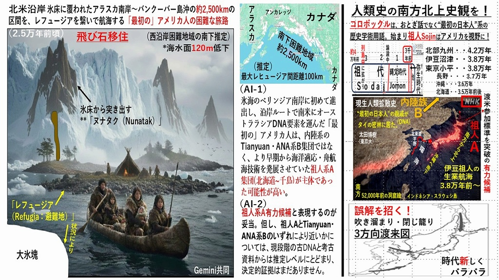 図左:「最初のアメリカ人」として先行の“第ゼロ波”は「マンモスを追って」ではなく、最寒期LGM (2.65~1.9万年前)頃における米新大陸西沿岸の“飛び石南下”であり、次いで後続波の広域拡散による重層・複数波が推定されています。