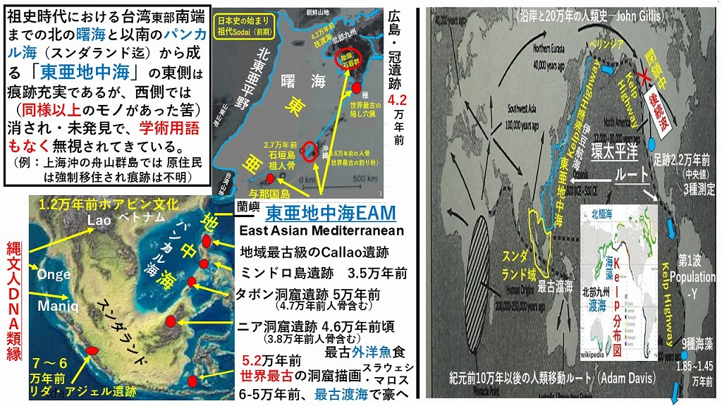 左図:東亜地中海(EAM)(仮称)は、台湾・蘭嶼の南端を境に北の曙海と南のパンカル海から成り、東側(熊本~沖縄~比~マレーシア・ニア洞窟)・南側(縄文人DNAと類縁含む)に比し西側の祖史遺跡が極端に少ないですが当然にして西側にもあったのであり、むしろ東側より充実していた筈ですが、例えば舟山群島の原住民強制移住の様に消され、何より海水面の100m上昇で発見が困難なためこれまで無視されてきていますが、現生人類の拡散史において欧州史における地中海(仏歴史学者 フェルナン・ブローデルの研究)のようにこの長大な大海の沿岸の重要性を認識すべきなのです。