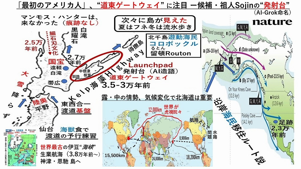 1.青森・陸奥平野で東西が合一した伊豆の生業航海民の子孫でもある「渡米参加標準突破」の北海道祖人(縄文人の先代)は、北米2.3万年前「足跡」の発見で人類史の「マンモス追い」定説が崩れた「沿岸・海藻ルート」説の高まりにより注目です。