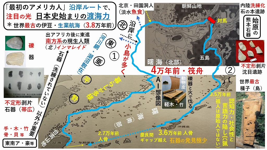 ➁4万年前、曙海北岸を時計回りで対馬海峡を筏舟で越える渡海力(約35km)を有し、沖縄に北海道に拡がった祖人は沖縄人骨・始原の熊本石器を残し、その認知力・社会性・言語力を要する陥し穴猟は渡海の造舟・操舟力と共に原始人ではない新人でした。