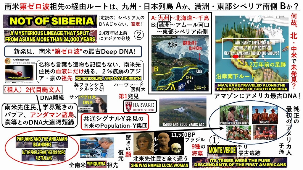 ➁DNAの謎は複数機関の分析で確認されて南米最古の「Population-Y」集団として命名・認識され、それはなぜか北米では発見無く、シベリア狩猟族とは異なることも判明しました。他方、北米ニューメキシコ「足跡」の5年間3手法の年代分析で確定(中央値2.2万年前)されて定説が崩れ、また、縄文人DNAがアンダマンOngeやマレー半島のManiq等の先住民と類縁であることが判明し、これまでは北米とのDNA違いで無視されて来た祖人Sojinが浮上して、今や最初のアメリカ人問題はシベリア人が脱落して、初渡米人類の発地は、九州Aか満洲Bか?という状況なのです。(次回、検討の結論)