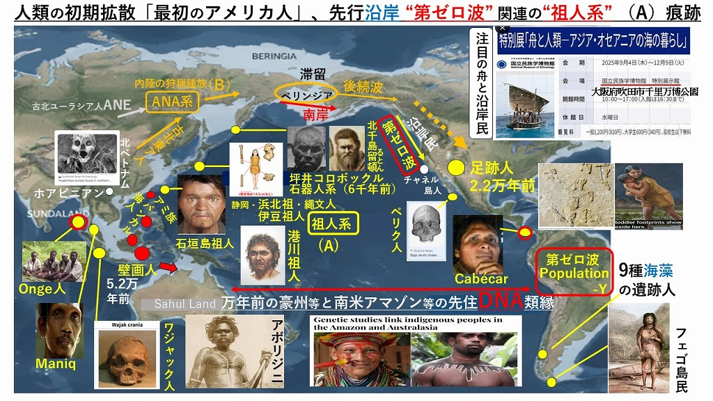 定説が崩れて祖人系Aの先行説が浮上で、後続大拡散の内陸ANA系Bとの2波説になっています。