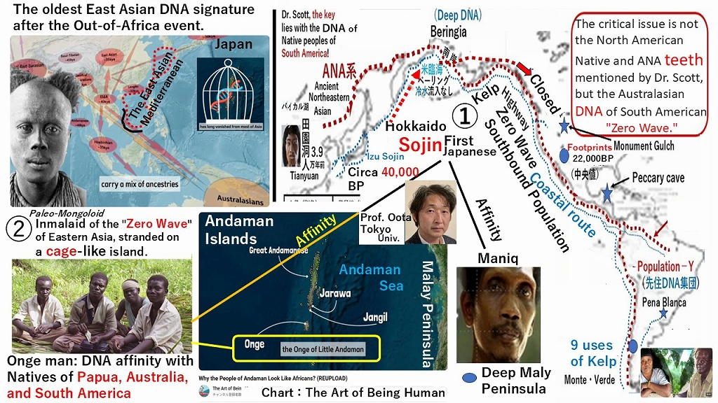 ➁The Jomon ancestor Sojin DNA related to the Onge and Maniq, represents an early migration wave preserved in insular refugia (“cage-like islands”). Therefore, this Sojin lineage is a candidate for the coastal route dispersal, supported by their maritime livelihood, such as the 38,000-year-old obsidian voyages off the coast of Izu.
