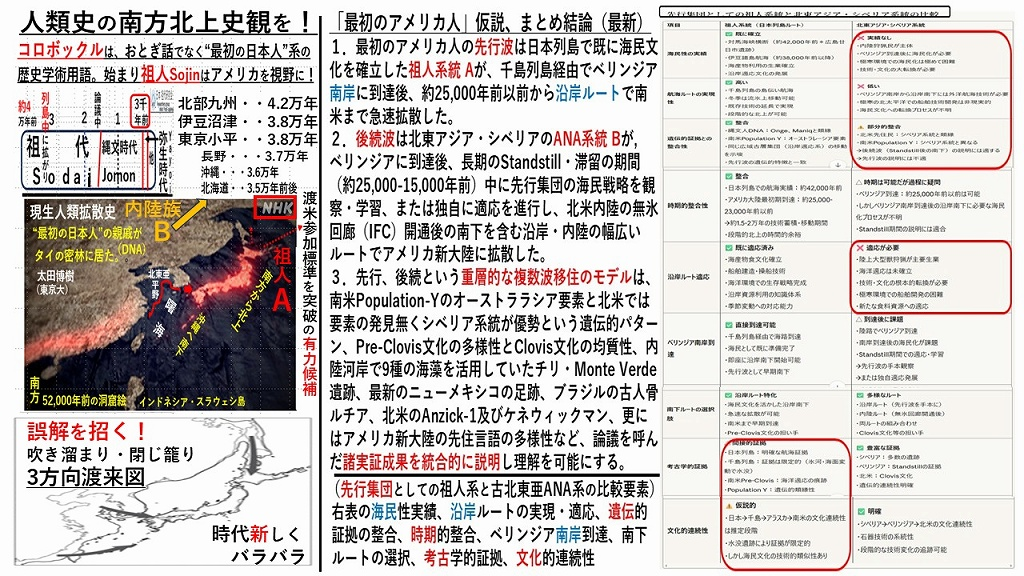 図中:「最初のアメリカ人」論議は、「マンモスを追って陸峡から進入」の定説は崩れ、祖人系A「先行」の新大陸西沿岸の南下進入と「後続」の内陸ANA系Bの幅広い拡散という重層的な複数波移住のモデルが、積み上げた諸実証成果を統合的に説明。時期的な「最初の」集団の検討要素(図中下)の詳細分析(図右)は、青森・北海道から北上継続の渡米参加標準を突破する祖人は海民性を示し、北の氷海の沿岸南下の論議で有力な候補(欧米学界は依然として内陸族イメージを引きずり)。先ずは論議に縄文JomonやAinuではなく、世界の誤解を正す祖人Sojin・祖代Sodaiの時代適切な用語導入から。