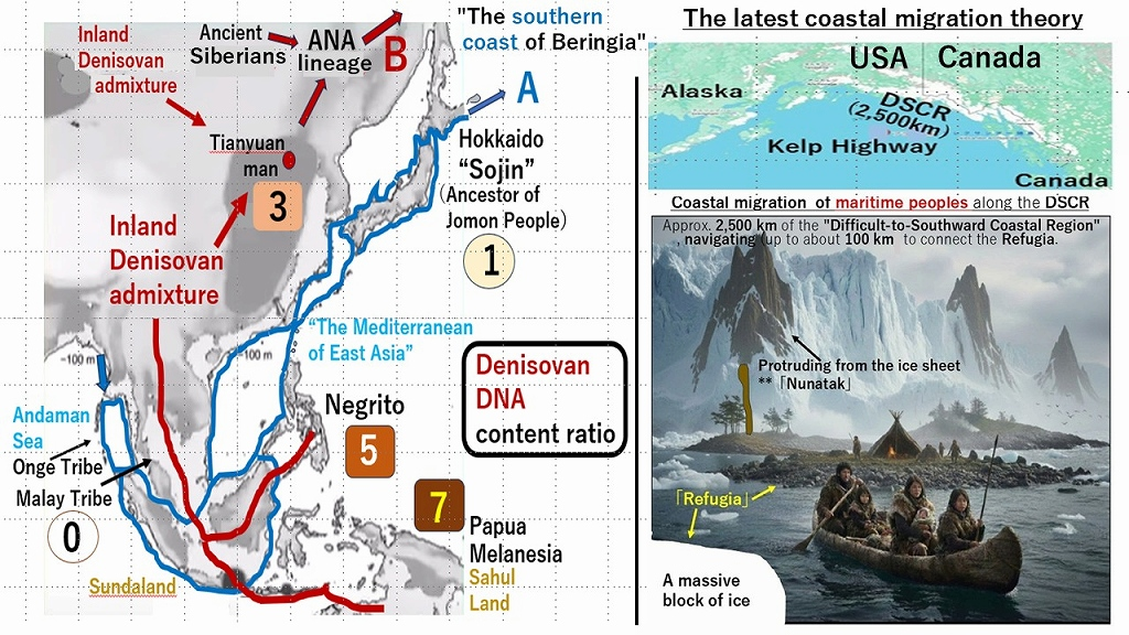 Left Image/Point: People in the Andaman Sea region also show “almost zero” Denisovan DNA. When mapping the extent of admixture from inland Denisovans, a pattern emerges: the expansion of coastal route peoples (from the Andaman Sea to “The Mediterranean of East Asia”) becomes clear. This raises the question: Who were the people who migrated south along “the southern coast of Beringia,” relying on boats and a marine diet in the harsh, icy northern seas?