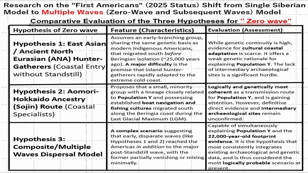 Figure Right: Recent discoveries, including the 22,000-year-old (median age) footprints in New Mexico and Australasian DNA elements (Population Y) in South America, demonstrate that the dispersal solely after the Beringia standstill is insufficient for explanation. This necessitates the consideration of hypotheses based on a “Zero-Wave and Subsequent Waves” multi-layered model.