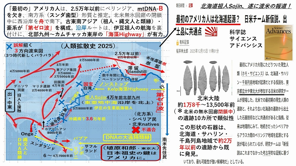 図左:近年のニューメキシコ「足跡」等の遺跡、南米Population-YのDNAシグナルなどの発見からマンモス定説は崩れ、最初のアメリカ人は先行、後続の重層で日本列島からの海藻Highwayに注目です。