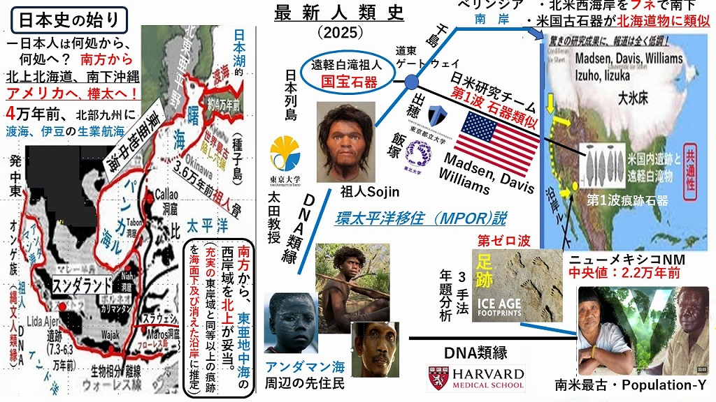 図中・右:最新の人類拡散史は、人々が示しています。アンダマン海先住民のスンダランド地域~DNA類縁の祖人は北上継続で、大氷床により閉鎖中の沿岸ルート第1波が米国各地の最古級遺跡の旧石器と類似~最初の第ゼロ波は、NM「足跡」からDNAがアンダマン・豪等の南方域先住民と驚きの類縁である南米最古Population-Y の人々へと繋がります。