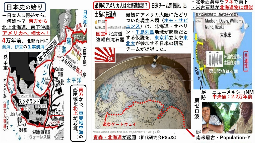 図中・右:「最初のアメリカ人」は北海道起源と初報道(正しくは、青森・北海道)があった2025です。祖人Sojinは、アメリカ新大陸が大氷床で閉鎖中の西沿岸ルートを南下・拡散したと考えられています。最初の第ゼロ波は米国ニューメキシコの「足跡」から、DNAがアンダマン・豪等の南方域先住民と類縁の南米最古のPopulation-Yシグナルへとなっています。続く第1波は、米国各地の最古級遺跡の旧石器と白滝石器が類似を実証という今回の日米チームの発表をメディアが報じています。