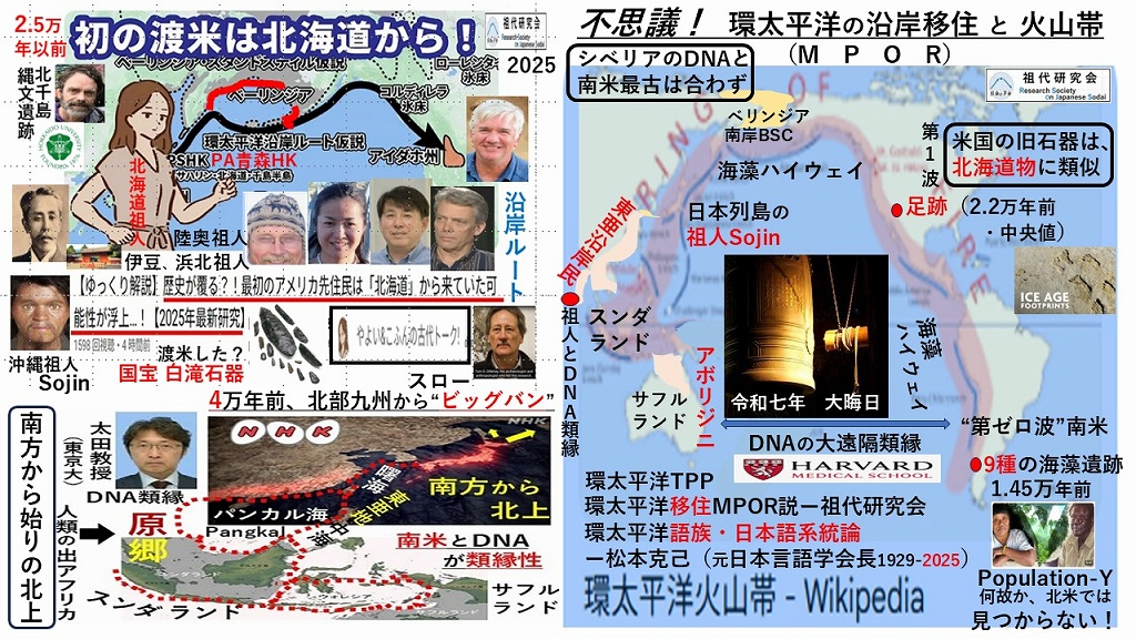 図右:あらためて南米(注目のPopulation-Y)南端までの環太平洋移住(MPOR)説(現代経済TPP、祖言語も)に光の年末となりました。