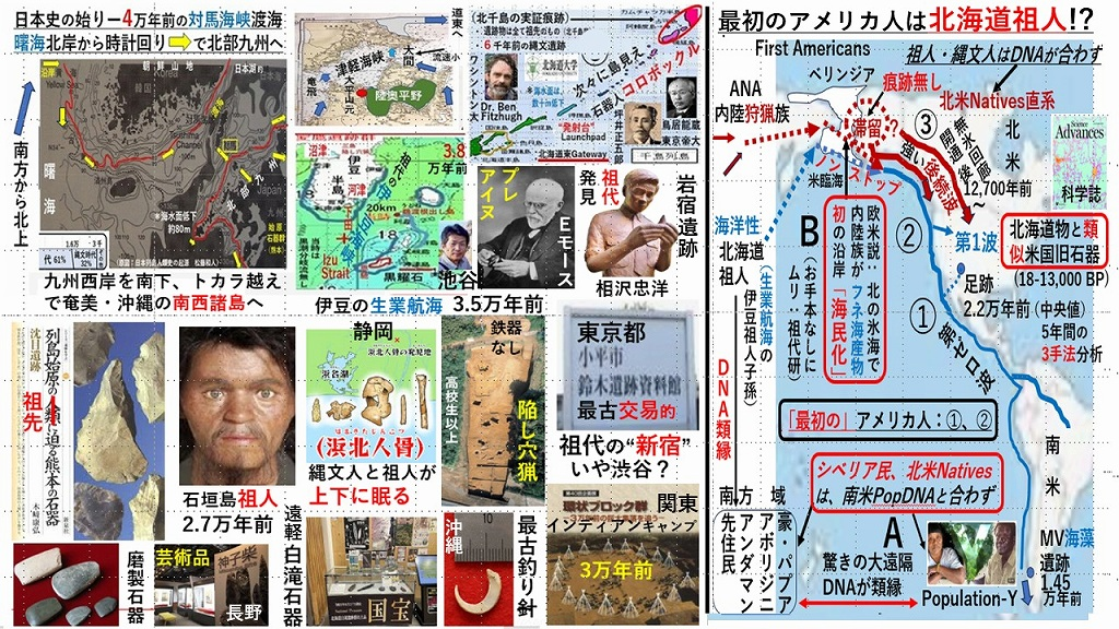 左上から、➀始まりは曙海北岸時計回りの黄矢印で対馬渡海、沖縄南下・北海道以北に北上のスローな“ビッグバン”、➁祖人の熊本で発見された始原の石器群、③祖人の復元顔は南方系、④実証の浜北人骨は祖人と縄文人繋がりの実証、⑤⑥⑦世界の1万年前の磨製・長野の芸術品の神子柴・白滝石器は国宝、⑧陥し穴猟は原始人ではなく、⑨釣り針は世界最古、⑩伊豆の生業航海に注目、左下⑪関東祖人のキャンプはインディアンNatives的、⑫.賑わいの”新宿”と言われる鈴木遺跡、13、14は歴史の扉を開いたモースと相沢、15.世界遺産・縄文物の基礎は陸奥平野祖人の文化、16.道東ゲートウェイから発進の北千島痕跡に光。大学、博物館、欧州等で埃を被っている貴重な史料の一挙公開と国際共同研究に期待です。