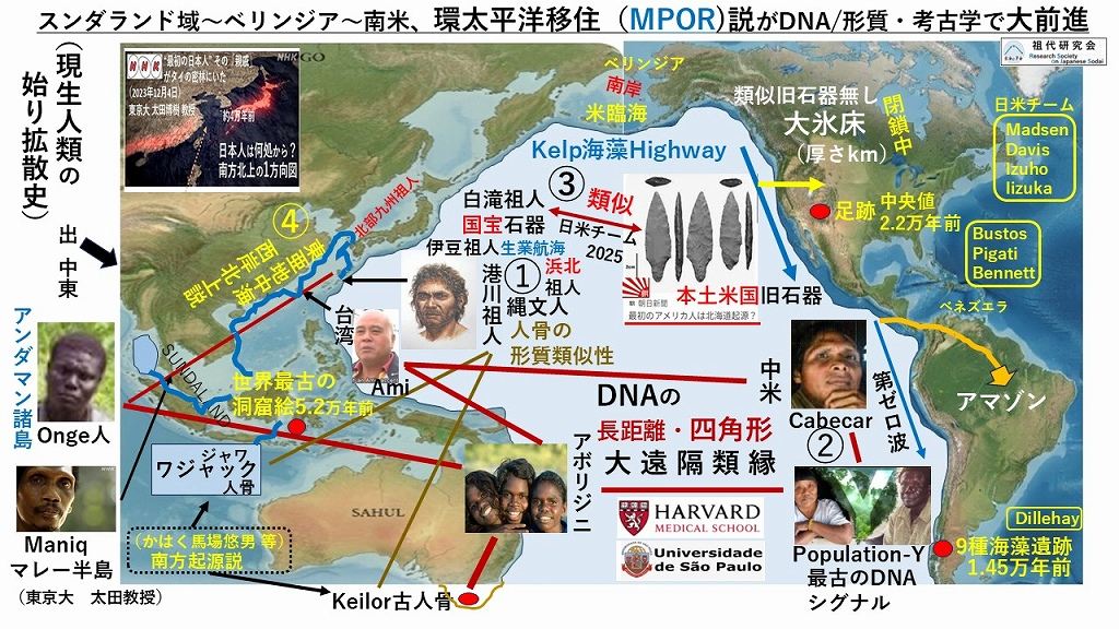 青森周辺(東北地方)は北部九州に渡海した祖人Sojinが、日本列島の東西から北上し当時の「陸奥平野」で合一していた海民性の強い人々であった。ここが後に「最初のアメリカ人人「第ゼロ波」の中心地で、氷河期の厳しい気候下で海を渡る技術を磨き、魚介や海洋資源を活用する生活を確立した。Y染色体ハプログループD(後のD1b系統)もここで強固に根付いていた可能性が高く、彼らは列島の北部を拠点に、ベーリング海方面への探検を繰り返していた。やがて、最終氷期最寒期(LGM、約2.6万〜1.9万年前)直前、気候の変動が激しくなる中、始まり祖人の先遣隊が動き出した。アムール川流域から南下する別の集団(主にmtDNA N9b系統を持つシベリア系民)の前に彼らは北上して行った。北海道東Gatewayを出発、千島列島やベーリング海の南岸(Beringia southern route)を伝い、ついにアメリカ新大陸の西岸に到達した。この移動で、mtDNA D4hから派生したD4h3aやD1系統が生まれ、これが南米のPopulation Yとして知られる古い集団の源流となった。Population Yは、南米の遺伝子プールにオーストララシアン様(縄文人やアンダマン人に似た)成分を注入し、通常のベーリング陸橋経由の東アジア祖先とは異なるシグナルを残しているが、これは、沿海民が太平洋ルートで早期に南下した可能性を示唆する証拠で、南米最古の先住民層(「最初の」アメリカ人)に直結する。