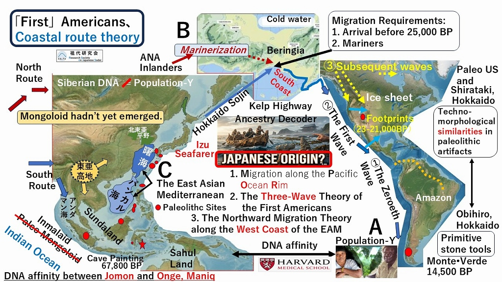 The traditional theory of mammoth hunters entering America via an inland route has collapsed. New evidence, such as the surprising discovery of Australian-related DNA in South America, crude stone tools and seaweed remains at ancient Chilean sites before Clovis, and the dating of footprints in North America, has shifted the consensus toward the Coastal Migration Route. Furthermore, analysis of North American Paleolithic artifacts has revealed similarities to those found in Hokkaido, pointing toward an origin in Japan.