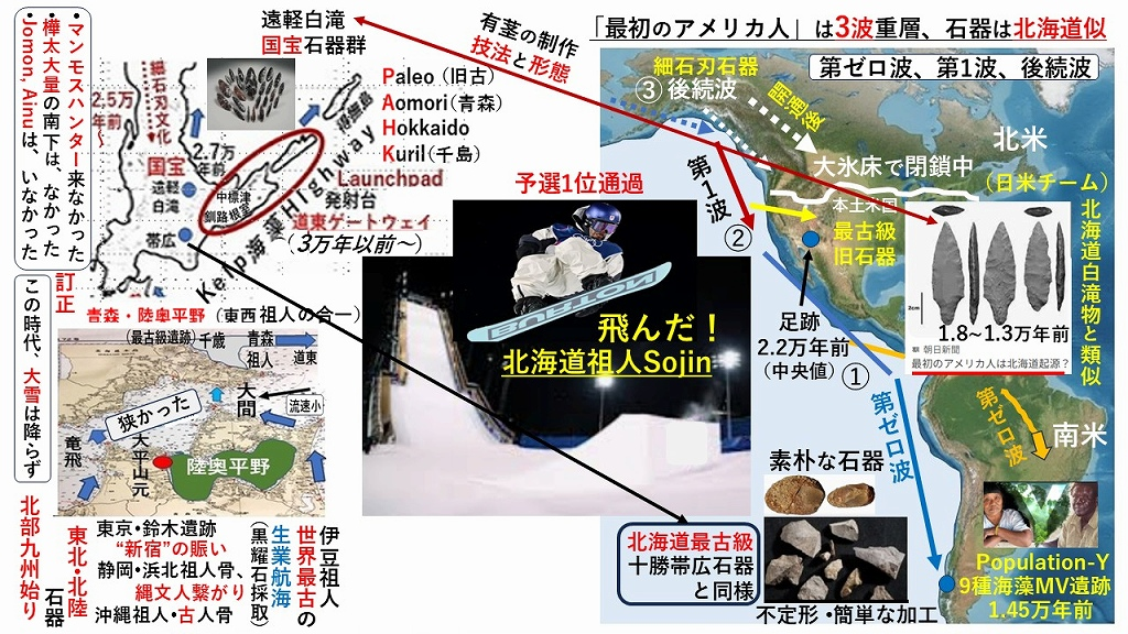 図右:「最初の」アメリカ人は最新の諸発見で西沿岸ルートからで、米国最古級旧石器の分析では北海道物と似てる!との最新研究発表です。