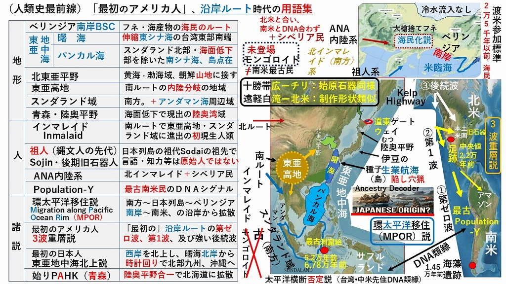 図左:地形環境•人•諸説の論議に必要な用語と共通認識の確立が重要です。東亜高地でなく沿岸ルート時代の東亜地中海(曙海+パンカル海)に注目であり、東側には始まり時代の遺跡が充実していますので、長距離の切れ目のなかった西側は海面下などで遺跡発見は殆どありませんが北上のルートであったと考えています。「見つからないことは無かった訳ではない」のです。始まり時代はまだ寒冷で身体変化のモンゴロイドが未登場の時代でしたので、出アフリカ•中東から東進した南方人を欧州学者が「古モンゴロイド」と命名したのは大雑把な誤解を招く不適切です。また、樺太南下(細石刃文化の伝搬はせいぜい2.5万年以降で渡米標準に達せず)でなく、陸奥平野時代の青森祖人の北上のPAHKに注目すべきなのです。何よりも始まりの北海道祖人Sojinという用語が無いために世界の学界でさえ誤解を招くJomon、Ainuが使われる誤りが散見されているのです。
