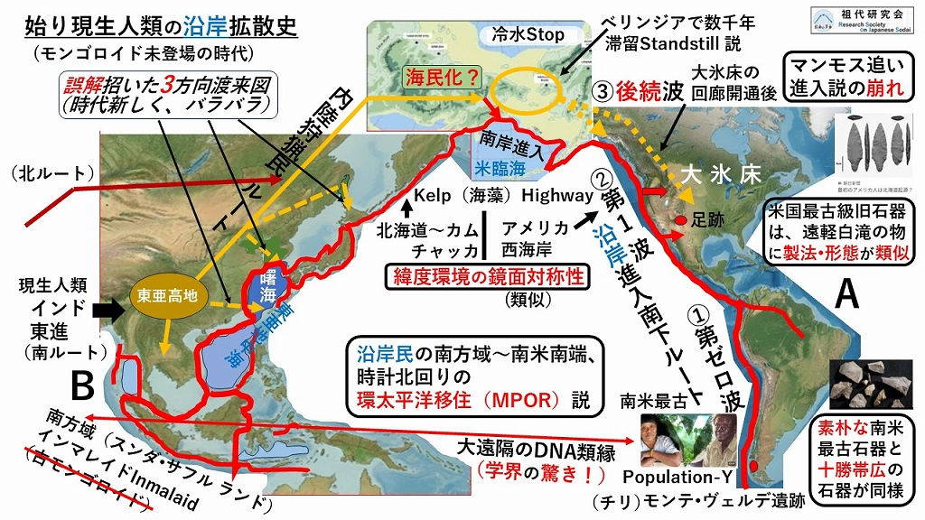 図左B:モンゴロイド未登場の時代に、南米先住民Population-YとDNA類縁の南方域から「東亜地中海」沿岸の北上(赤線)でアメリカ側の状況と接合する環太平洋移住MPOR説がムリなく導かれます。長く誤解を招いてきた3方向からの日本列島への渡来図が、北海道祖人Sojinの北上の継続を抑制したブレーキであったことは残念でした。