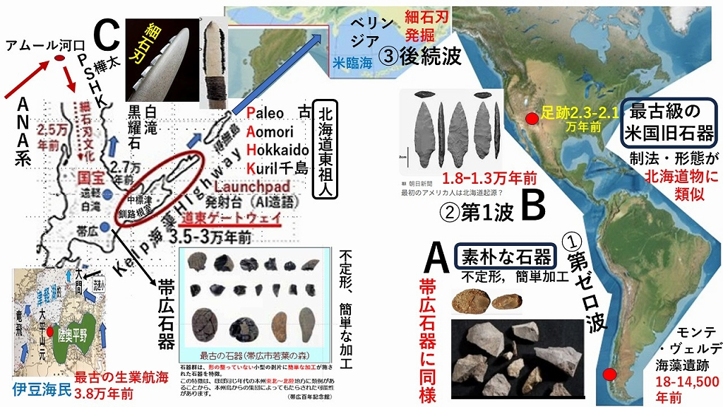 1.世界が議論する「最初のアメリカ人」は沿岸ルートからで、①第ゼロ波、②第1波、③後続波と区分され、素朴なモノからより精巧な石器の区分A、B、Cと符合します。