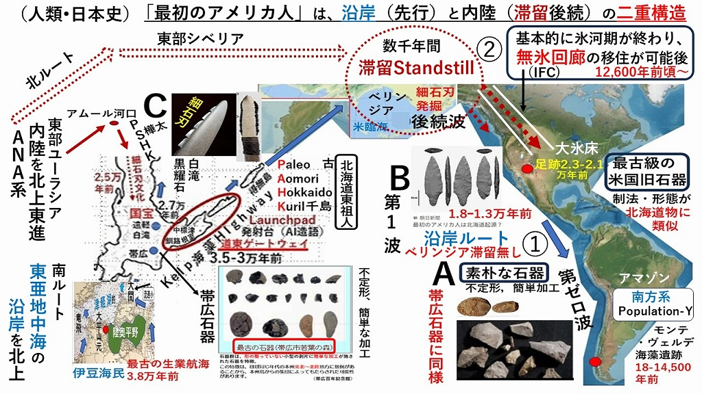 南米のモンテ•ヴェルデ海藻遺跡及び最古DNA痕跡にアジア南方系を含むPopulation-Y、北米の足跡発見及び内陸の無氷回廊(IFC)移住は12,600年前頃以降、ANA系進入DNAはベリンジアで数千年間の滞留で独自変化などから、