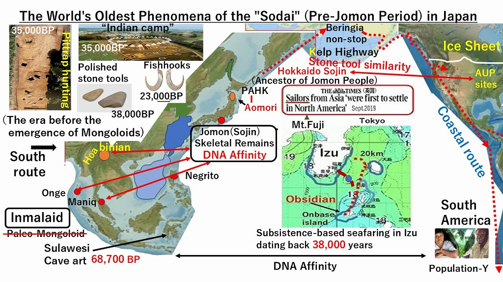 (Conclusion) With the discovery of Australasian DNA (Population-Y) in South America, it is now theorized that the First Americans migrated south along the western coast of the New World. Consequently, the seafaring Hokkaido Sojin have gained significant attention. Their DNA shows affinities with the southern Inmalaid people, leading to the “Pacific Rim Migration Theory.”