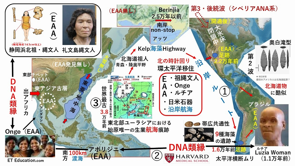 (背景と新説)2021年に米国ニューメキシコで発見された「2.2万年前(中央値)の足跡」や南米チリの1.6万年前の足跡が、最初のアメリカ人の米国進入についての学界定説「マンモス追い陸路の氷河明けの移住」という説明を破壊しました。なぜなら当時カナダを覆っていた巨大氷河により物理的に「陸路」は閉ざされて存在せず、西沿岸ルートから進入して来た説が唱えられてきています。この事が日本列島史の始まり時代における海洋性ある祖人Sojin(縄文人の先代)に目を向けさせ、「シベリア民が来た」定説(北米先住民のDNAの元)を揺るがせ、祖代研は「最初に祖人が沿岸から、後続でシベリア民が陸路からと提唱しています。更に、10年前にHarvard 医科大が発見したアンダマン諸島・豪州等の先住民と南米アマゾン古部族の驚きのDNA類縁の謎も、出アフリカ・中東後の東進の南方から東部ユーラシア内陸狩猟族が北上してシベリアから「海民化してアラスカ沿岸に」と言う説明に対し、祖代研は、厳しい北の海で狩猟族がお手本も無しに「フネと海産物食」の暮らしに切り替えるのはムリで、南方から西太平洋沿岸を北上し日本列島を発射台に沿岸を移住した「環太平洋移住Migration along Pacific Ocean Rim-MPOR」説を提唱(数年前から)してきています。
