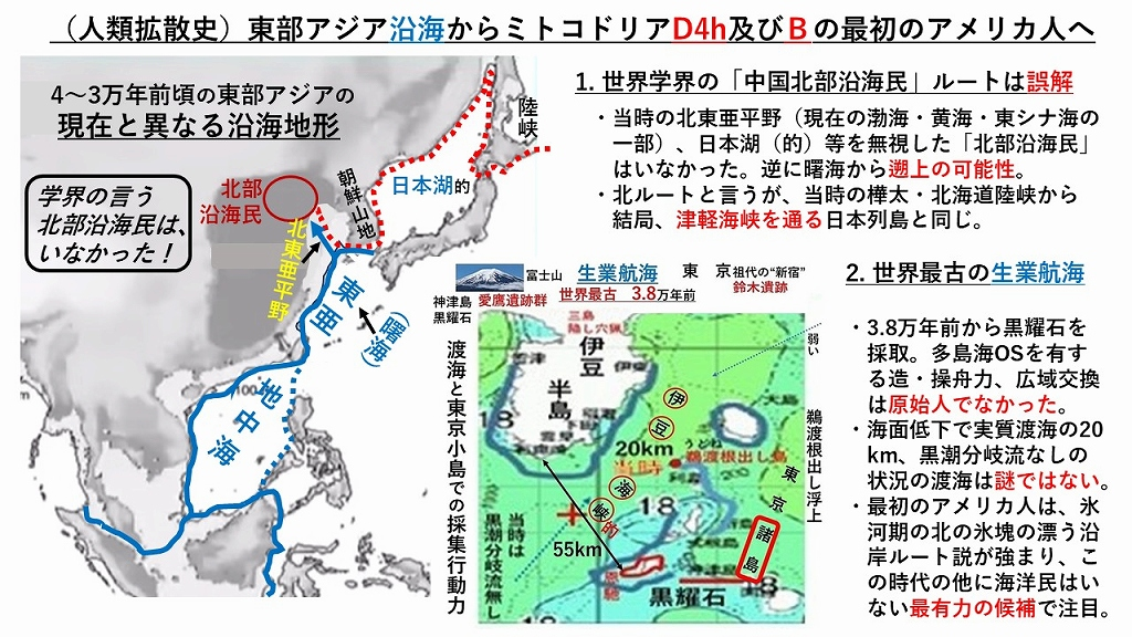 この3つから、南米にまで沿岸を拡がった「最初の」アメリカ人は、むしろ後続の影響力強く上書きしたシベリアバイカル地域系・ANA系ではないと導かれ、それでは誰かとなれば「日本列島を通過のKelp Highway北上の海民」が最も可能性が高いと自然に結論が出るが、「マンモスを追って進入」定説を引きずるあるいは当時の地形を全く無視し「中国北部沿海民」などと言う存在しない事を持ち出す論文を認めたように放置する世界の学界の現状は全く異常かつ不思議である。